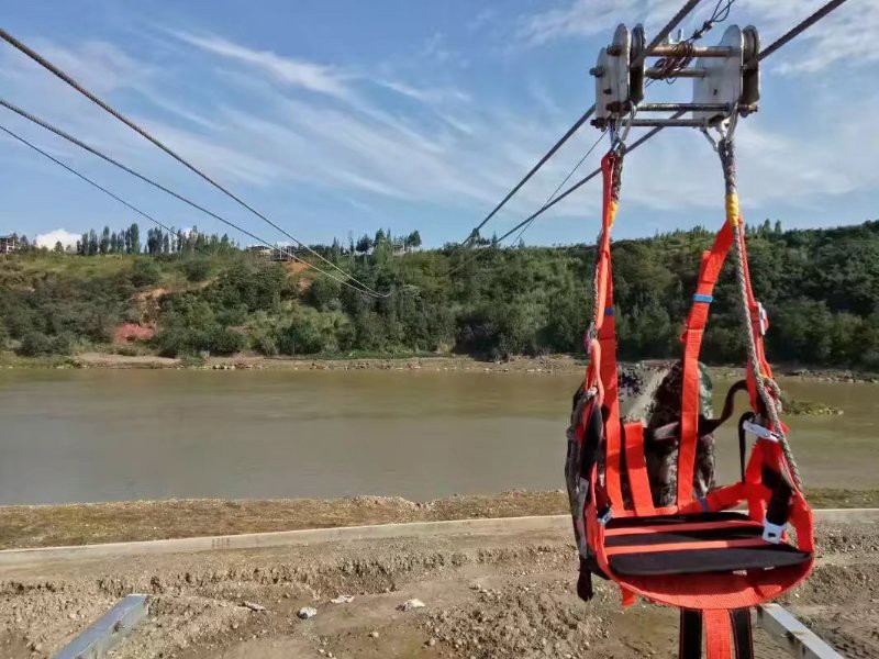 滑索主要由鋼筋混凝土基礎、上站及下站門型結構支架、吊具(包括滑車和吊帶,其中滑車分雙輪和四輪,以及帶限速和不帶限速等形式)、緩沖裝置、防護裝置、吊具回收裝置、承載索、牽引索等組成。